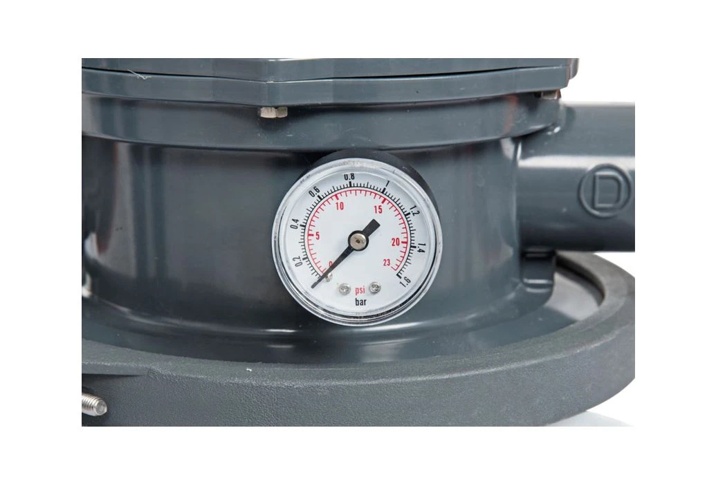 De regelklep heeft 6 verschillende filterfuncties: filteren, gesloten, zand reinigen, spoelen, afvoeren en circuleren. De tank met een diameter van Ø25,4 cm heeft een inhoud voor 9 kg zand.