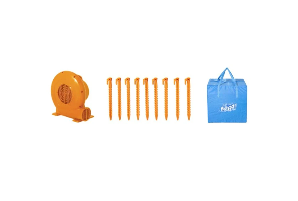 Het H2OGO! Mount Splashmore waterpark wordt binnen 2 minuten volledig hebt opgeblazen. Het waterpark en de blower staan vast in de grond d.m.v. de meegeleverde grondharingen. Om te zorgen dat de glijbaan nat blijft is het Bestway waterpark uitgerust met een ingebouwde waterdispenser, welke aan te sluiten is op een tuinslang. Tevens zit er een gaasdoek boven in de toren zodat kinderen veilig kunnen spelen.