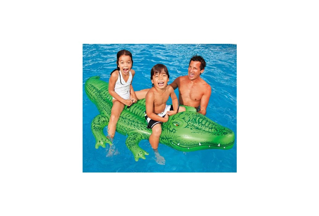 Drijf mee op de rug van deze grote krokodil en geniet van het samen spelen in het zwembad.