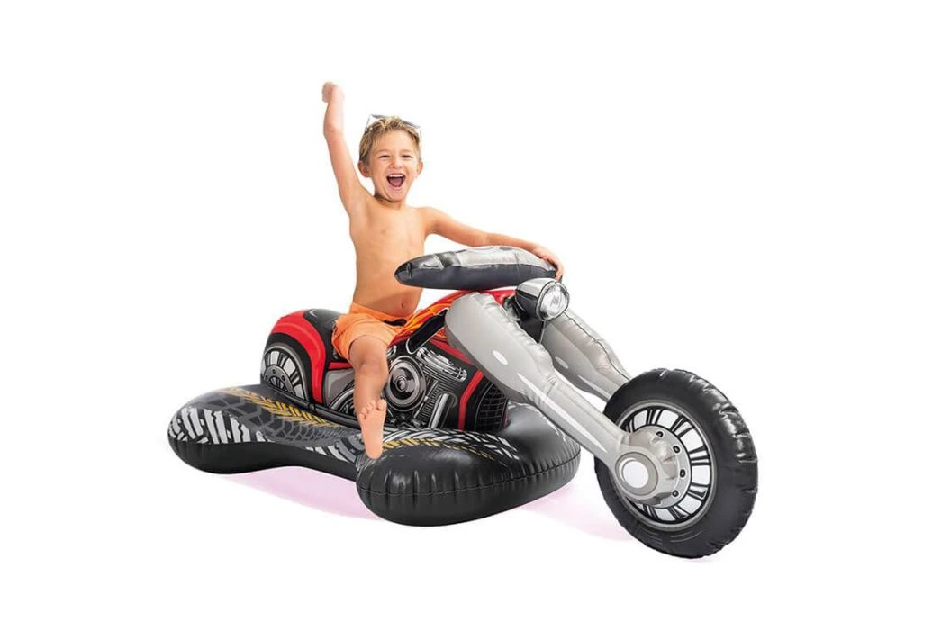 Zwemmen wordt nog leuker met deze stoere motor van Intex! Deze Intex ride-on heeft 2 handvaten en heeft extra stabiliteit door het ondervlak. De motor is 180 x 94 x 71 cm groot. Het opblaasbaar voertuigje is gemaakt van stevig 0,35 mm vinyl, wat superstevig is. De opblaasbare motor wordt geleverd inclusief een reparatiesetje.Â