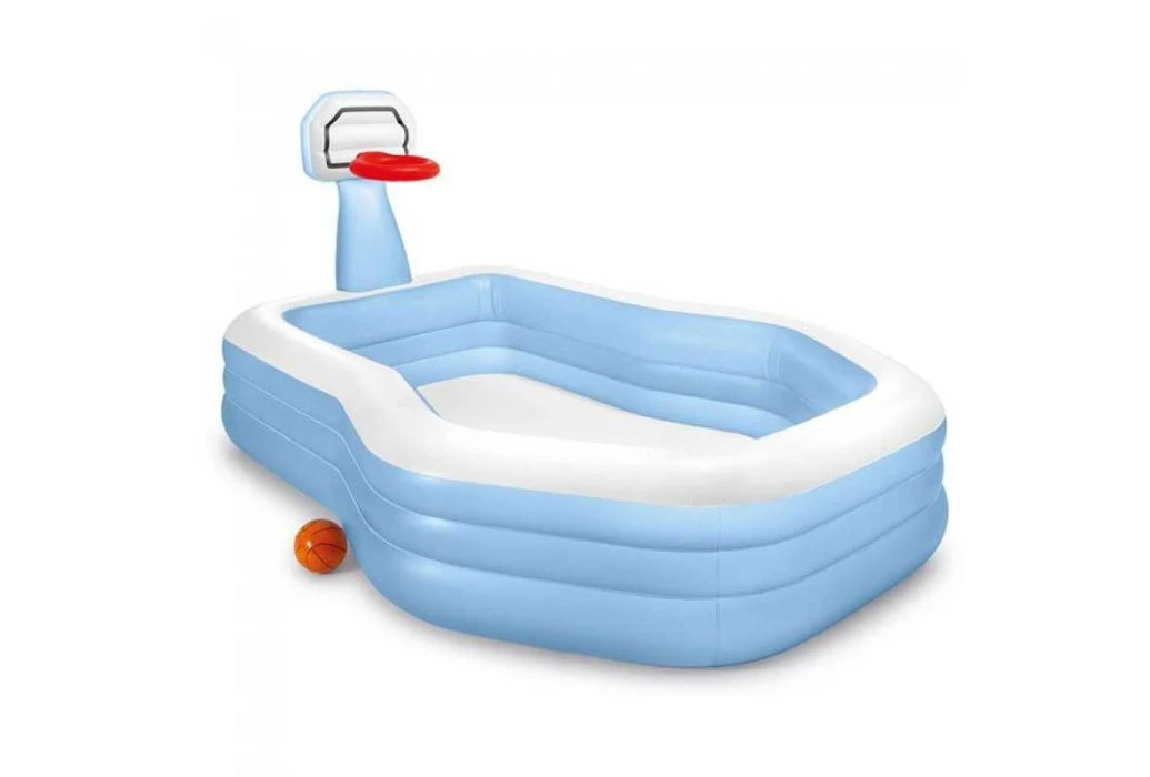 Het Shootin’ Hoops zwembad van Intex bestaat uit een opblaasbaar zwembad met op de rand een opblaasbare basket. Dit zwembad heeft een wandhoogte van 32 cm en kan gevuld worden met maximaal 682 liter water. Inclusief een afvoerstop, zodat je na gebruik gemakkelijk het water kan laten weglopen. Het opblaasbare zwembad is gemaakt van 0,33 mm dik vinyl en is goed bestand tegen basketballende kinderen.